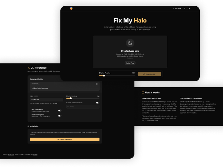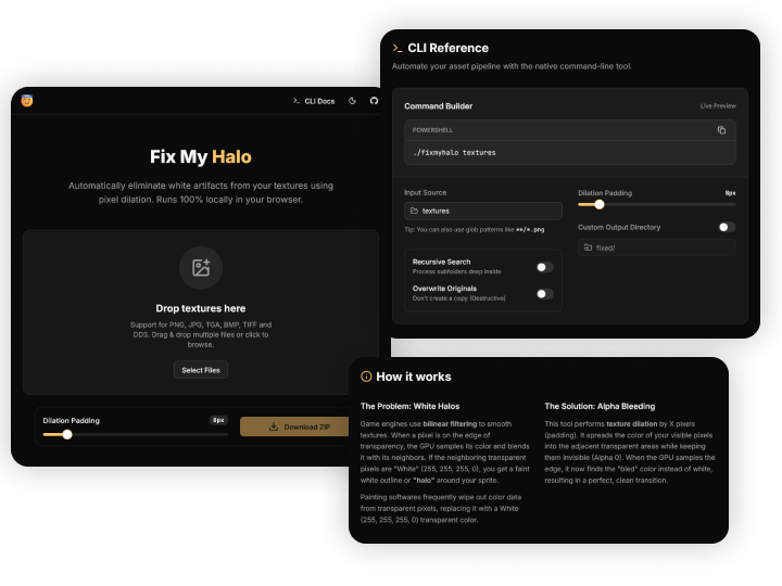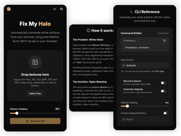 Fix My Halo é uma solução de engenharia híbrida projetada para resolver um problema comum em motores de jogos (como Unity): o aparecimento de "halos brancos" ao redor de sprites que contém transparencia devido à filtragem bilinear. O projeto implementa um núcleo de processamento em Rust que é compilado tanto para um executável nativo de alta performance quanto para WebAssembly (Wasm) como uma biblioteca, permitindo que a mesma lógica rode diretamente no navegador do usuário sem backend.