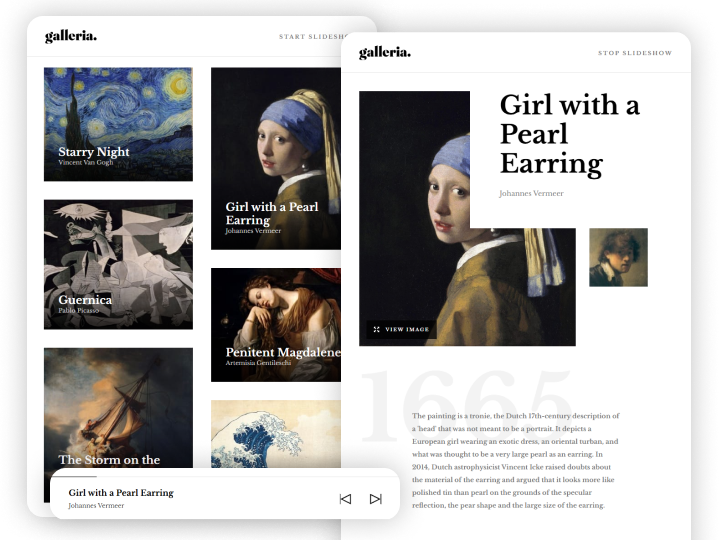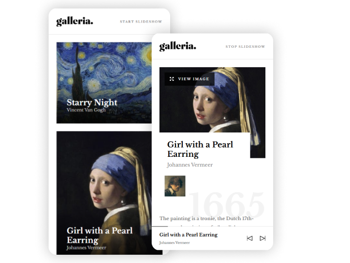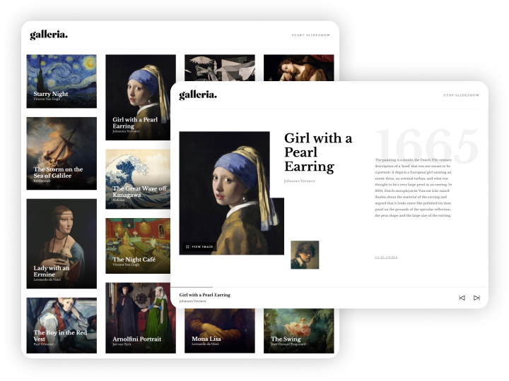 Galleria é uma aplicação Next.js focada na exibição de arte de alta fidelidade. O projeto utiliza Static Site Generation (SSG) para garantir que o conteúdo seja entregue instantaneamente, combinando a robustez do React com um algoritmo de layout "Masonry" para criar uma experiência visual coesa e responsiva.